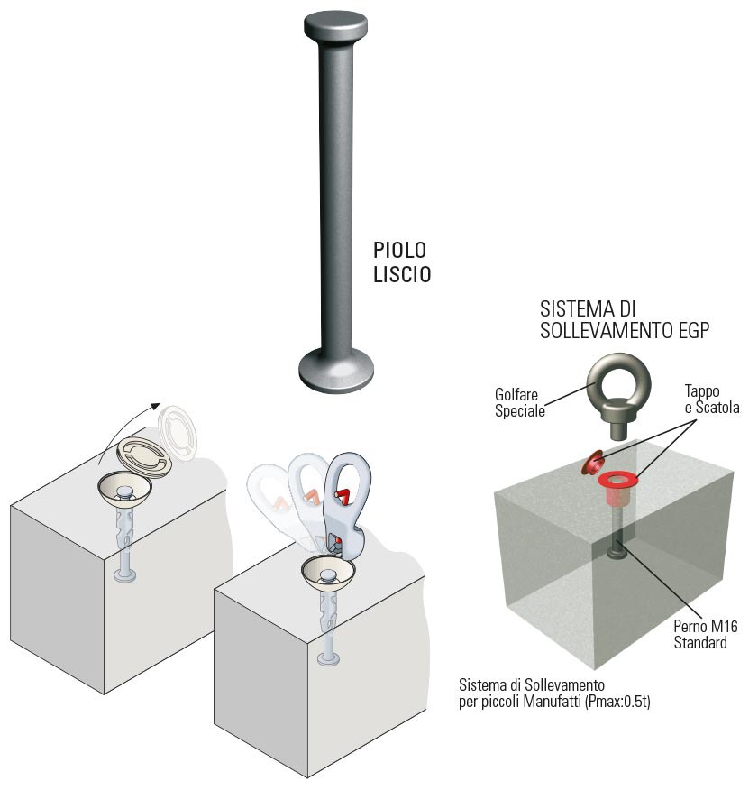 E’ essenzialmente costituito da un inserto, PIOLO di sollevamento, da predisporre preventivamente nei casseri prima del getto dei manufatti e da una MANIGLIA per l’aggancio del piolo stesso durante le movimentazioni, che funge, in pratica, da connettore tra “l’attrezzatura di sollevamento” (gru,carroponti ecc. ) e l’inserto nel calcestruzzo.